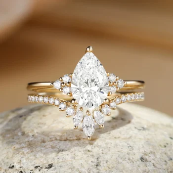 Crafted with meticulous attention to detail, this pear-cut lab-grown diamond ring is paired with a delicately designed vintage-inspired wedding band, creating a harmonious blend of modern brilliance and old-world charm. Whether you’re planning to propose, renewing your vows, or searching for a luxurious yet affordable diamond ring, this set is the perfect choice for brides-to-be who value both beauty and responsibility. 💕